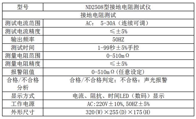 ND2508型交流接地電阻測試儀適合用于測量各種電機、電器、儀器儀表、家用電器等設備的外殼與其接地線之間的電阻值。